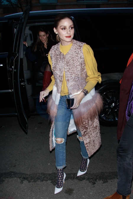 Olivia Palermo w dlugiej, futrzanej kamizelce w drodze na pokaz mody