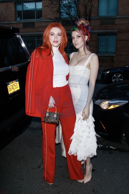 Bella Thorne w czerwonym garniturze i w rudych wlosach