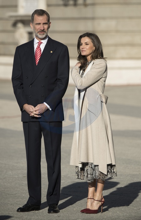 Krolowa Letizia w wezowej sukience i krol Filip przyjmuja pare prezydencka z Peru