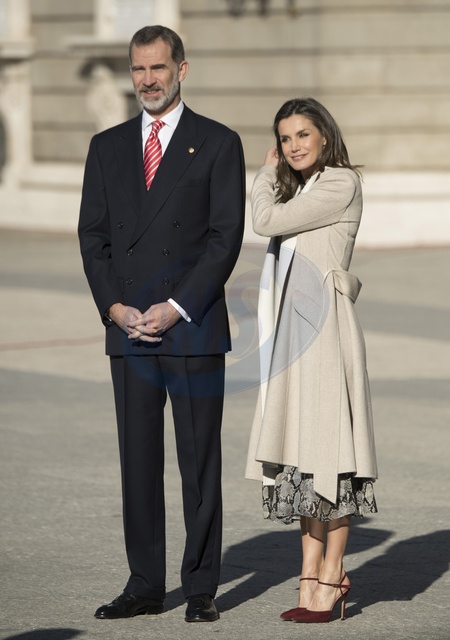 Krolowa Letizia w wezowej sukience i krol Filip przyjmuja pare prezydencka z Peru