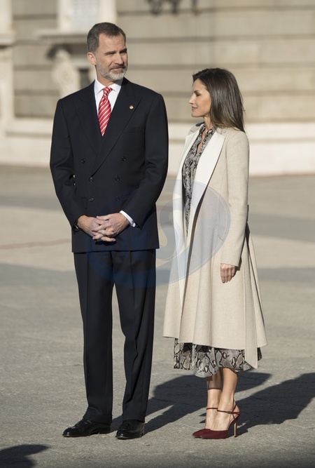 Krolowa Letizia w wezowej sukience i krol Filip przyjmuja pare prezydencka z Peru