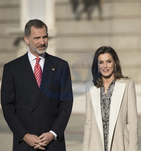 Krolowa Letizia w wezowej sukience i krol Filip przyjmuja pare prezydencka z Peru