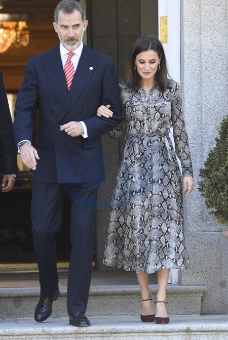 Krolowa Letizia w wezowej sukience i krol Filip przyjmuja pare prezydencka z Peru