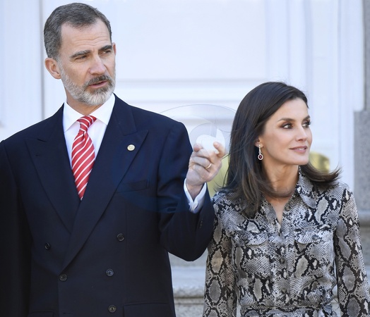 Krolowa Letizia w wezowej sukience i krol Filip przyjmuja pare prezydencka z Peru