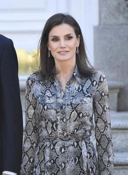 Krolowa Letizia w wezowej sukience i krol Filip przyjmuja pare prezydencka z Peru