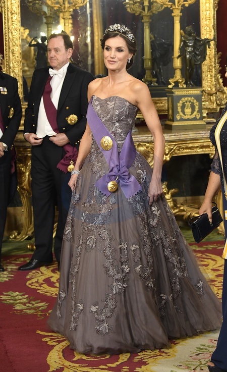 Krolowa Letizia w balowej sukni i w diademie na przyjeciu dla pary prezydenckiej z Peru