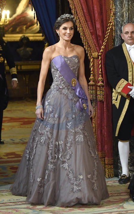 Krolowa Letizia w balowej sukni i w diademie na przyjeciu dla pary prezydenckiej z Peru