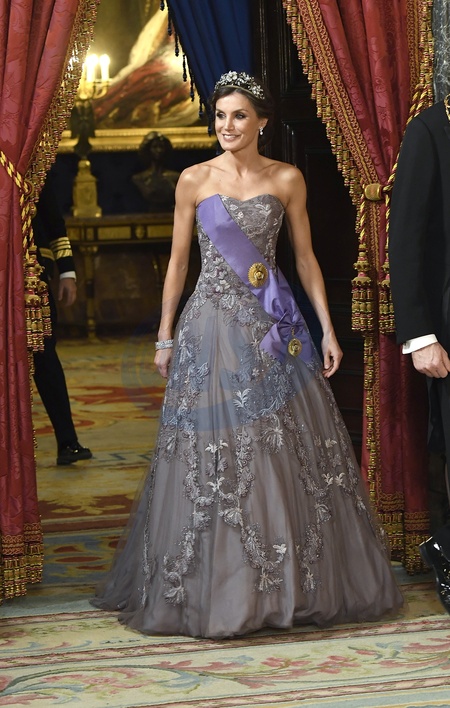 Krolowa Letizia w balowej sukni i w diademie na przyjeciu dla pary prezydenckiej z Peru