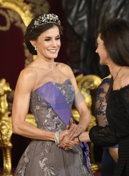 Krolowa Letizia w balowej sukni i w diademie na przyjeciu dla pary prezydenckiej z Peru