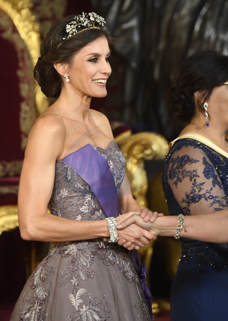 Krolowa Letizia w balowej sukni i w diademie na przyjeciu dla pary prezydenckiej z Peru