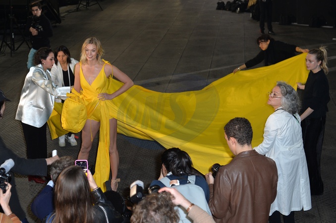 Karlie Kloss z ogromnym, zoltym trenem na backstage pokazu Off-White
