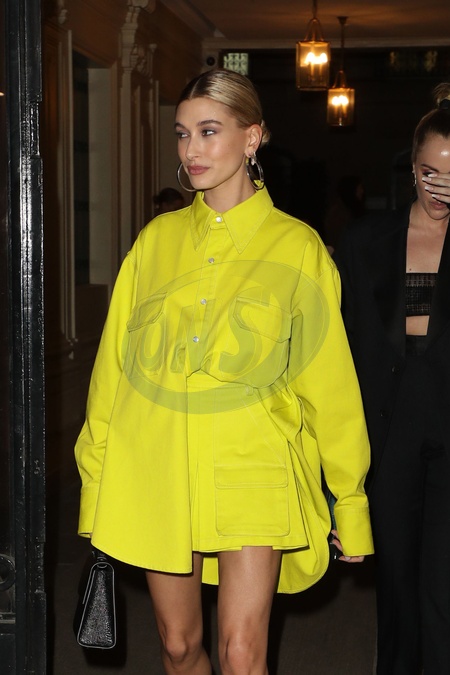 Hailey Baldwin w zoltej koszuli i z golymi nogami