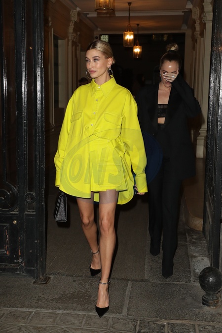 Hailey Baldwin w zoltej koszuli i z golymi nogami