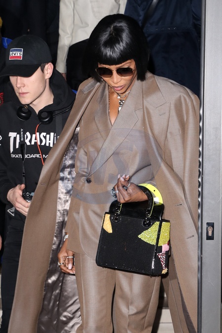 Naomi Campbell w eleganckim plaszczu i z kolorowa torebeczka