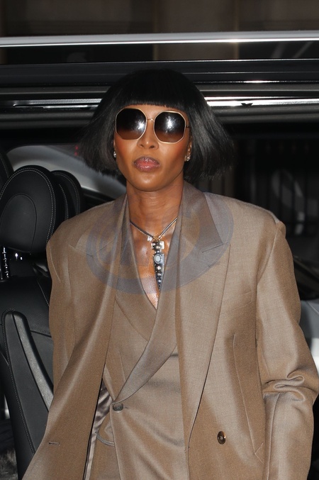 Naomi Campbell w eleganckim plaszczu i z kolorowa torebeczka