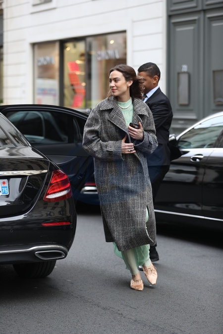 Alexa Chung w cieplym, szarym plaszczu i delikatnych balerinkach