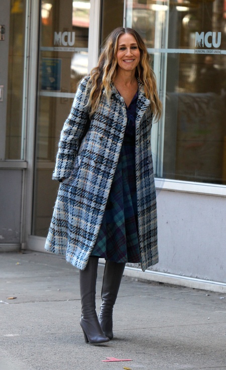Sarah Jessica Parker w kraciastym plaszczu
