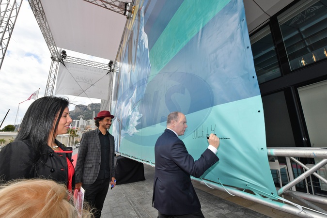 Ksiaze Albert II i Eduardo Kobra pozuja przy dziele artysty dla Yacht Club
