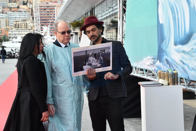 Ksiaze Albert II i Eduardo Kobra pozuja przy dziele artysty dla Yacht Club