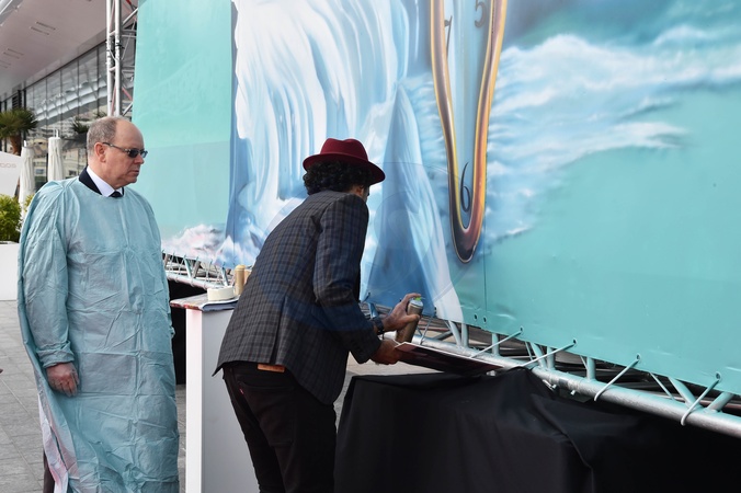 Ksiaze Albert II i Eduardo Kobra pozuja przy dziele artysty dla Yacht Club