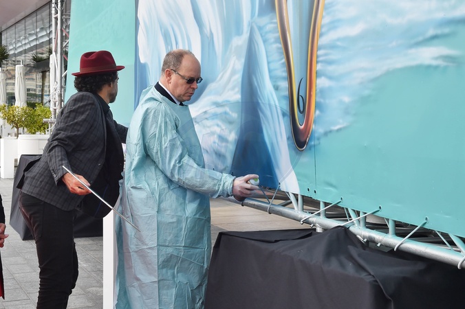 Ksiaze Albert II i Eduardo Kobra pozuja przy dziele artysty dla Yacht Club