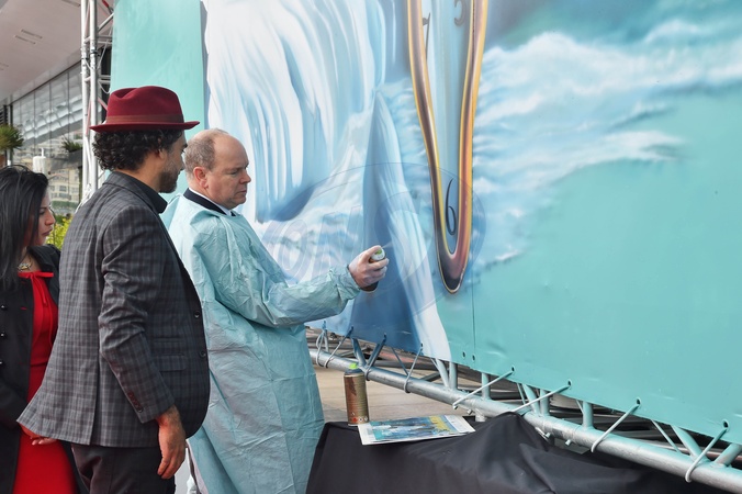Ksiaze Albert II i Eduardo Kobra pozuja przy dziele artysty dla Yacht Club