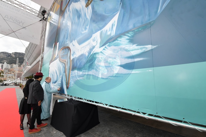 Ksiaze Albert II i Eduardo Kobra pozuja przy dziele artysty dla Yacht Club