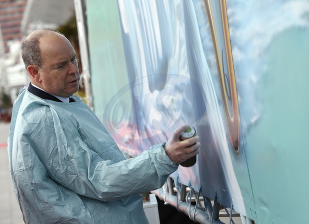 Ksiaze Albert II i Eduardo Kobra pozuja przy dziele artysty dla Yacht Club