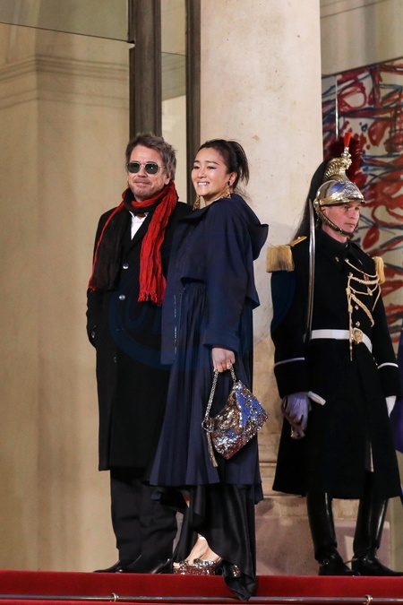 Jean-Michel Jarre ze swoja przyjaciolka Gong Li w drodze na przyjecie w Palacu Elizejskim