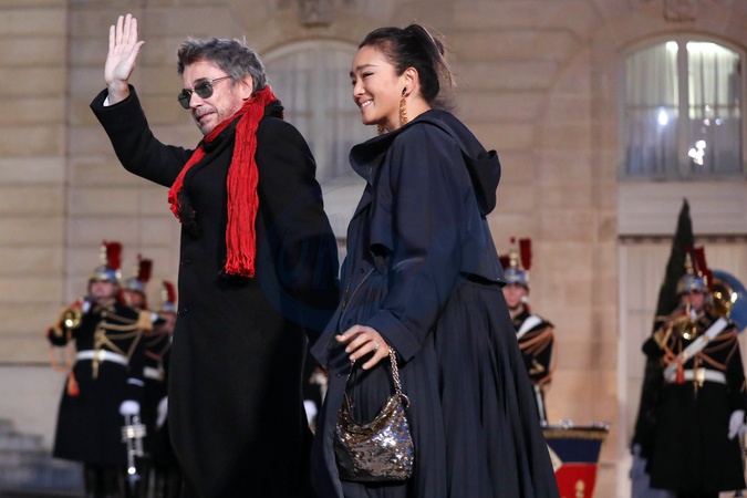 Jean-Michel Jarre ze swoja przyjaciolka Gong Li w drodze na przyjecie w Palacu Elizejskim