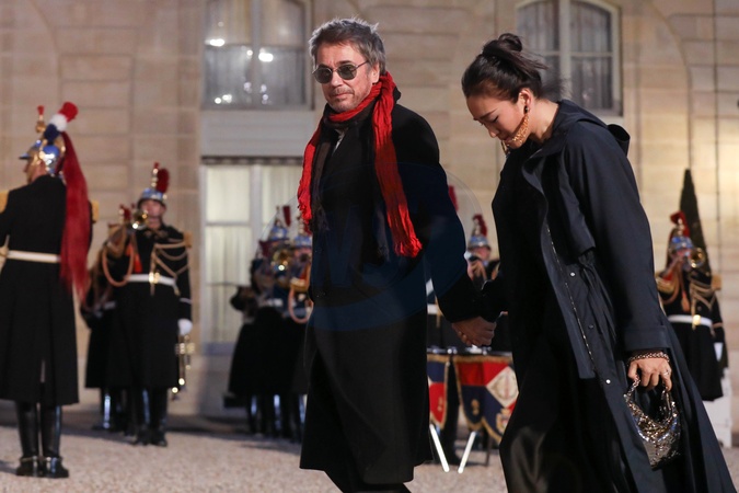 Jean-Michel Jarre ze swoja przyjaciolka Gong Li w drodze na przyjecie w Palacu Elizejskim