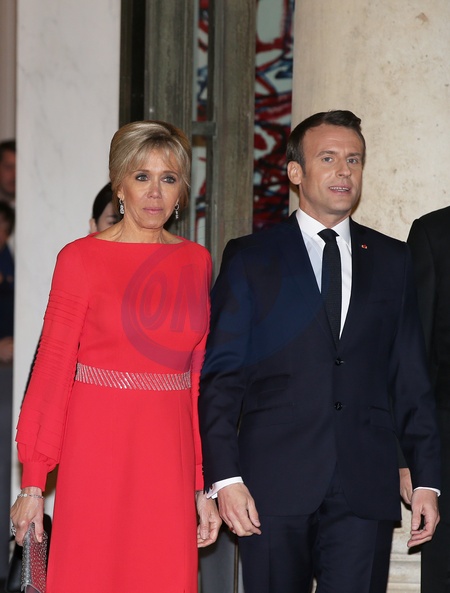 Brigitte Macron w czerwonej, eleganckiej sukience na przyjeciu w Palacu Elizejskim