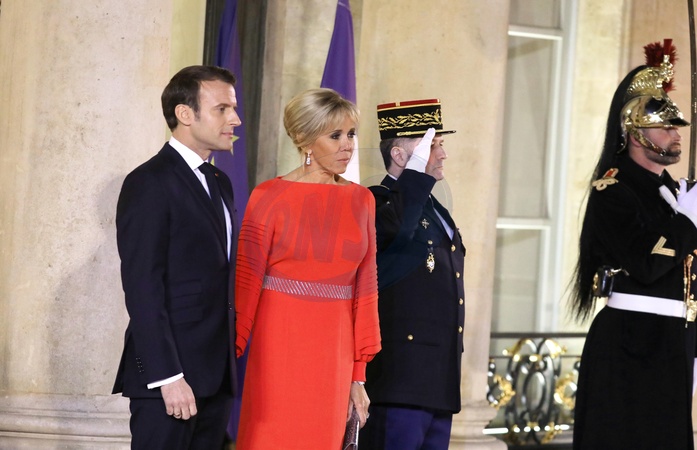 Brigitte Macron w czerwonej, eleganckiej sukience na przyjeciu w Palacu Elizejskim