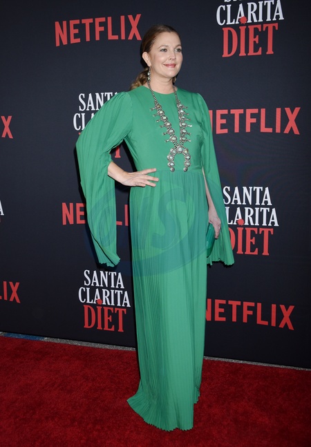 Drew Barrymore w zielonej sukni na premierze Netflixs Santa Clarita Diet Season 3