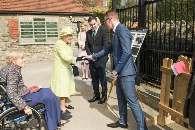 Krolowa Elzbieta II karmi konia marchewka podczas wizyty w Manor Farm Stables