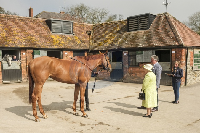 Krolowa Elzbieta II karmi konia marchewka podczas wizyty w Manor Farm Stables