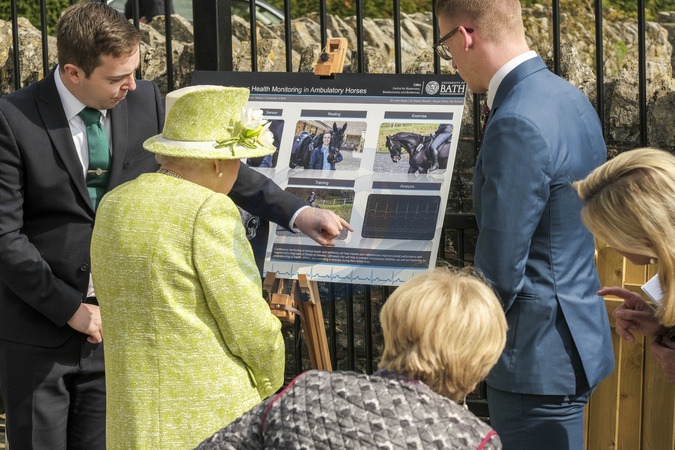 Krolowa Elzbieta II karmi konia marchewka podczas wizyty w Manor Farm Stables