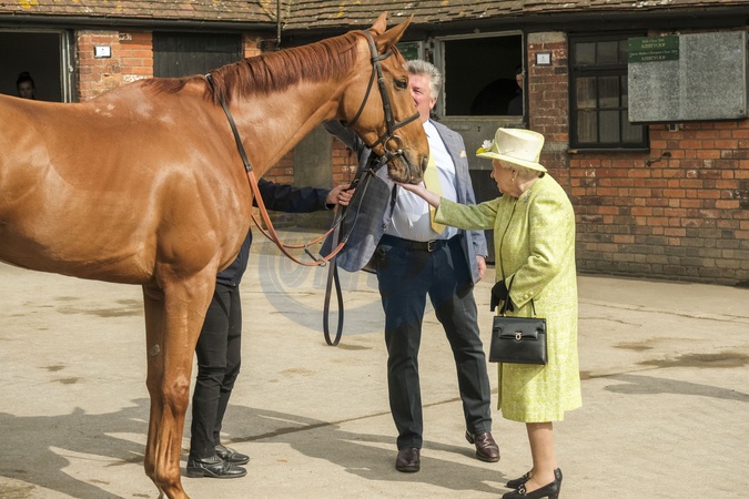 Krolowa Elzbieta II karmi konia marchewka podczas wizyty w Manor Farm Stables