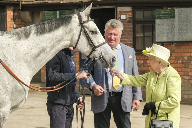 Krolowa Elzbieta II karmi konia marchewka podczas wizyty w Manor Farm Stables