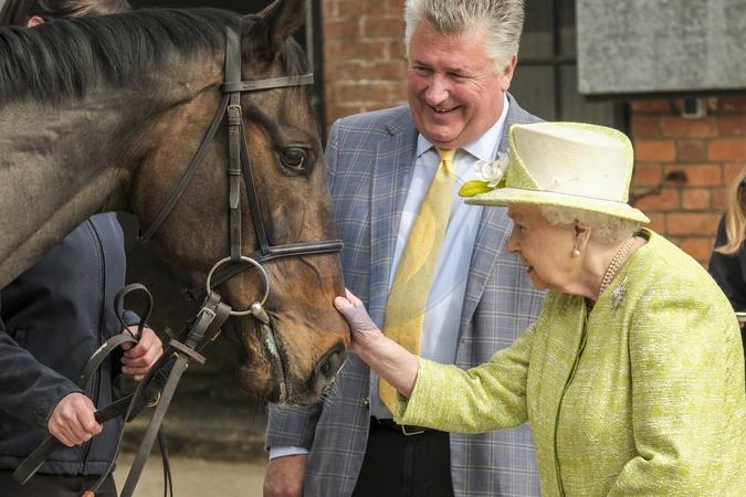 Krolowa Elzbieta II karmi konia marchewka podczas wizyty w Manor Farm Stables