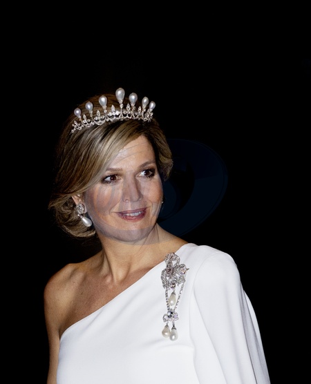 Krolowa Maxima w bialej sukni i krol Willem Alexander na corocznej gali dla korpusu dyplomatycznego