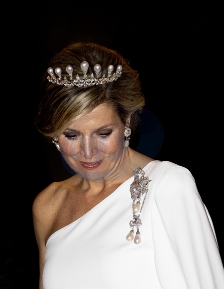 Krolowa Maxima w bialej sukni i krol Willem Alexander na corocznej gali dla korpusu dyplomatycznego
