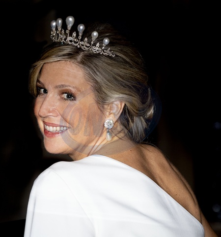 Krolowa Maxima w bialej sukni i krol Willem Alexander na corocznej gali dla korpusu dyplomatycznego