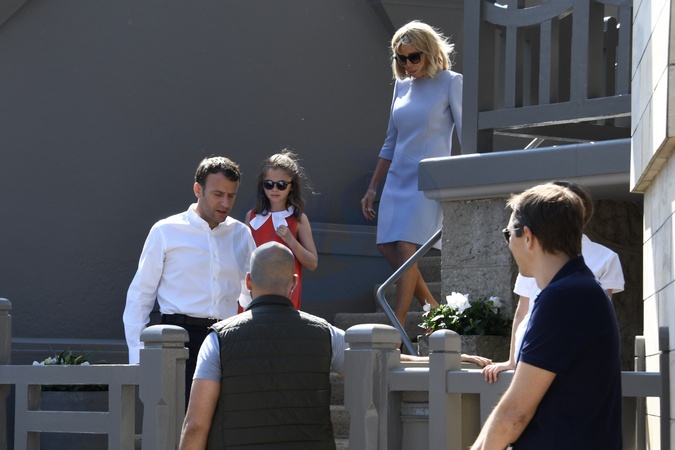 Macronowie z wnuczka wychodza z domu