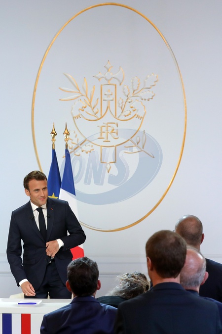 Emmanuel Macron podczas konferencji w Palacu Elizejskim