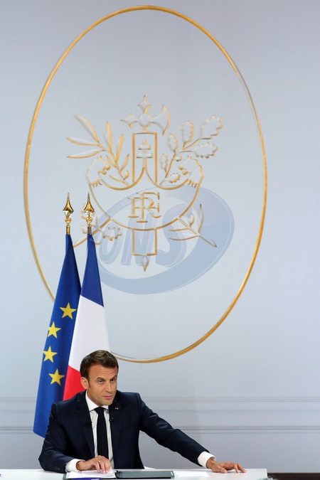 Emmanuel Macron podczas konferencji w Palacu Elizejskim