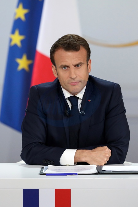 Emmanuel Macron podczas konferencji w Palacu Elizejskim