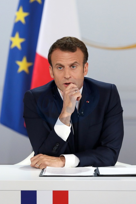 Emmanuel Macron podczas konferencji w Palacu Elizejskim
