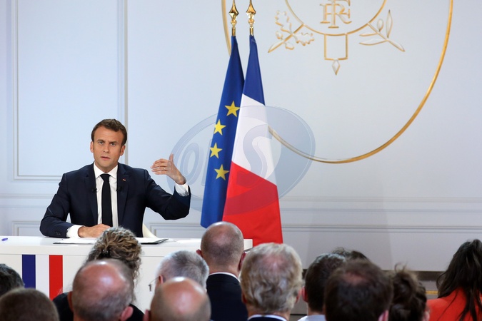 Emmanuel Macron podczas konferencji w Palacu Elizejskim