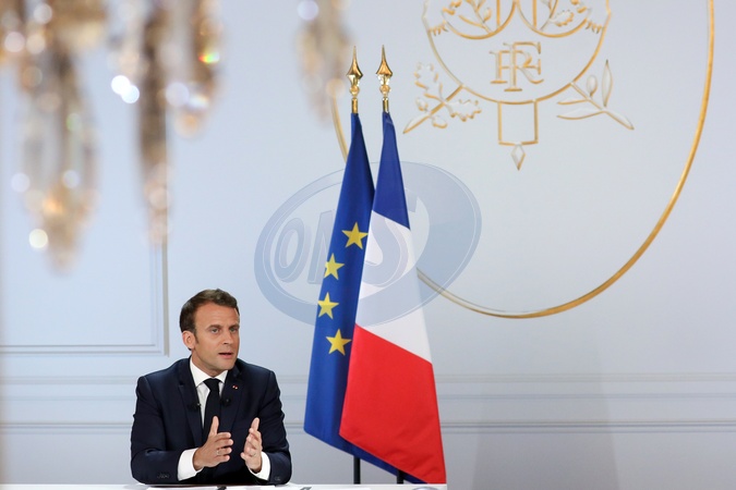 Emmanuel Macron podczas konferencji w Palacu Elizejskim
